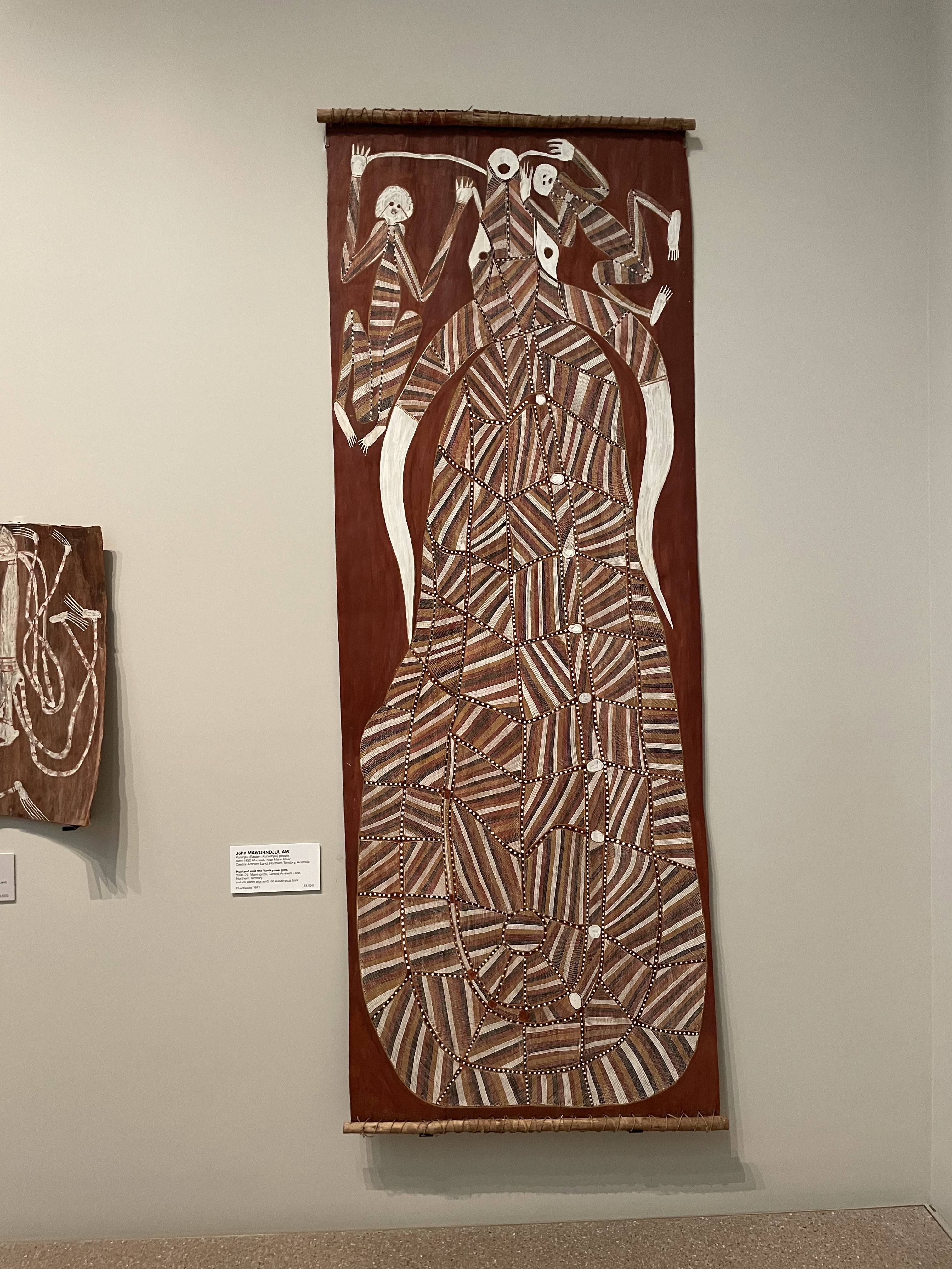 In Chinese culture this world of spirits is mapped in Feng Shui but it is also looked on as superstition. I find it quite genuine to see the indigenous artists bringing these spirits to life on bark before the 1980s as some tribes were still living on the land. Also it maps human experience and how poeple explain the world they live in. I feel like some of the more modern indigenous work I saw was more or less the same but took in their own experience of culture under the eye of Western values and sometimes a larger spiritual experience was expressed that left one awestruck.
