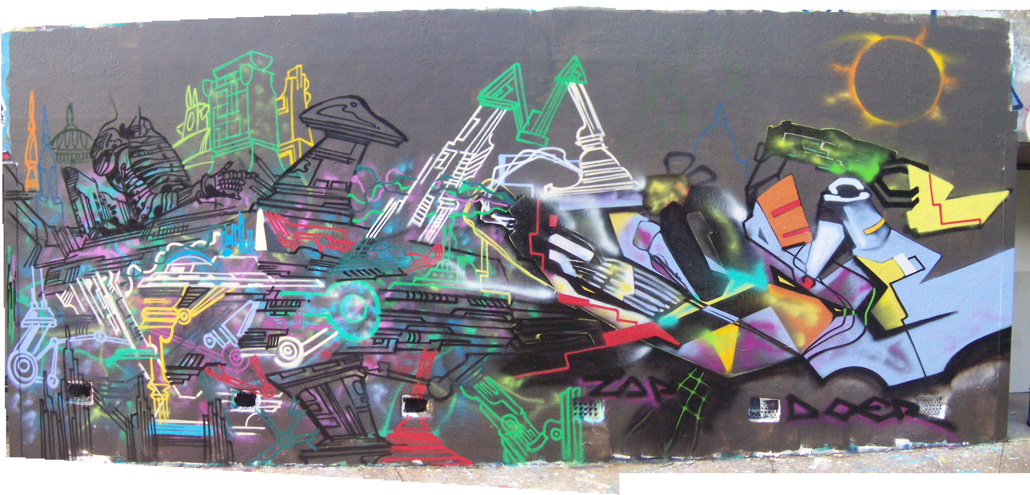In the late nineties, we witnessed the explosion of the internet and it affected my art practice, in my aerosol art I was bringing reference material I had printed from Google images of bacteria, cells and my own drawings. In 2000 I created a couple of walls that were in this vein. As the rise of the internet settled and the new millennium had started I did various other work, I think my main concern over the first decade of the new millennium was what did I need to do to stay human. In what ways am I unique from robots or rising technologies? I referenced robots in a 2008 collaboration with Zapgalaxy that I called ‘Mission to Mars’ in 2009 I did a portrait of Kase2 who created the style ‘Computer Rock’ in the eighties and the portrait was my way of outdoing any rising technologies and staying as creative as possible. In 2009 there were gimmicky robot drawing technologies but this sounded an alarm to me so I was determined to be as creative as ‘humanly’ possible.